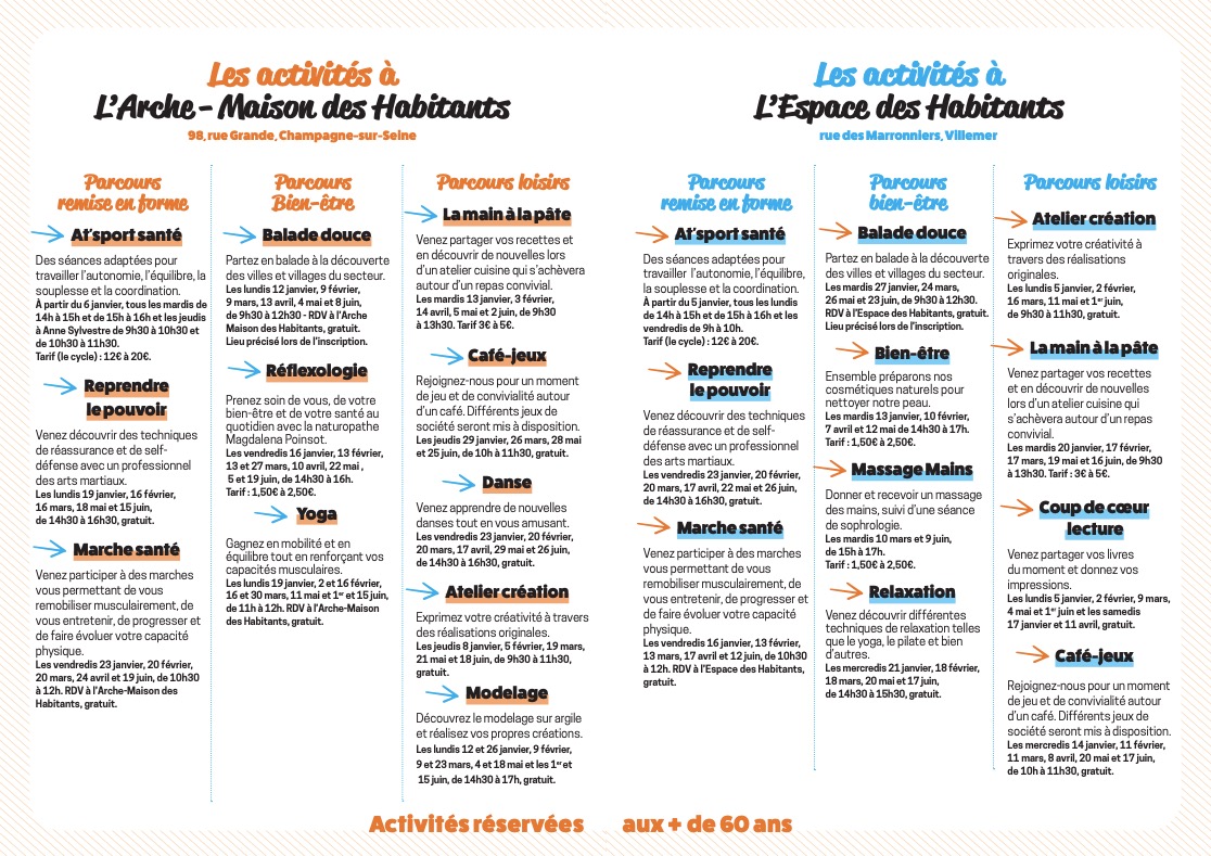 L'Arche - Maison des Habitants et l’Espace des Habitants proposent un programme d’activités hebdomadaires réservées aux seniors. Ateliers culinaires, bien-être, beauté, relaxation, balades douces, ou gym adaptée vous attendent à Villemer et à Champagne-sur-Seine.